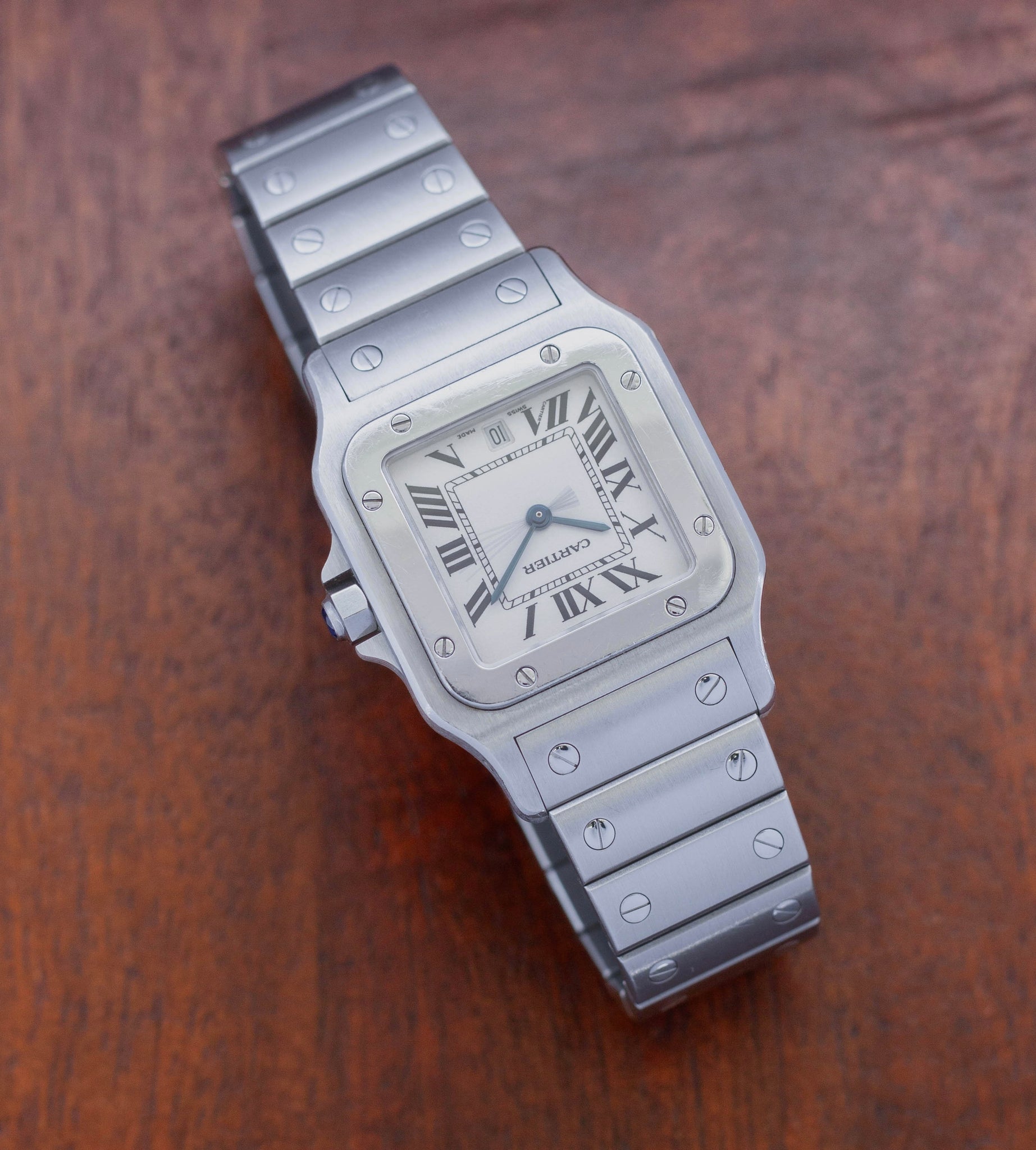 We kennen de Cartier Santos Galbée veelal in de goud-stalen variant, maar uiteraard is deze ook uitgevoerd in een volledig stalen versie, die zorgt voor een sportievere uitstraling. De vintage Cartier Santos Galbée 1564 die wij hier aanbieden verkeert in uitstekende staat. De 29 mm kast is vlijmscherp en lijkt ongepolijst, net als de stalen bezel, waardoor alle originele hoeken en lijnen nog goed zichtbaar zijn. Het horloge vertoont enkele gebruikerssporen, maar deze zijn in het echt zeker niet storend. Let wel: doordat de foto’s in hoge resolutie zijn gemaakt, kunnen bepaalde imperfecties op de foto’s zichtbaarder lijken dan in werkelijkheid.