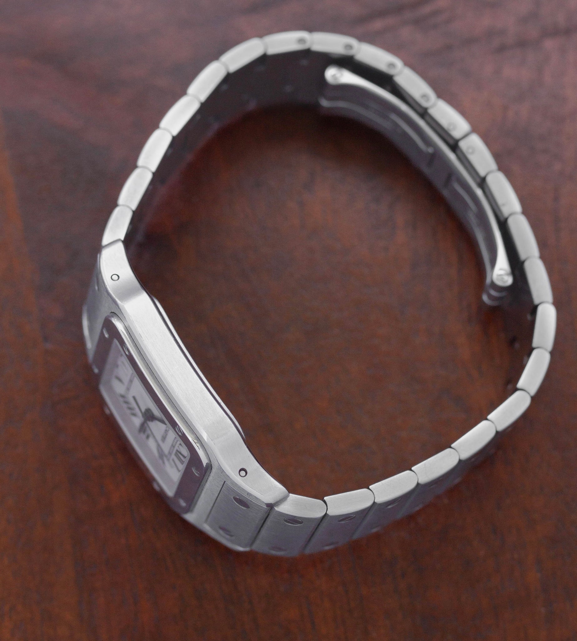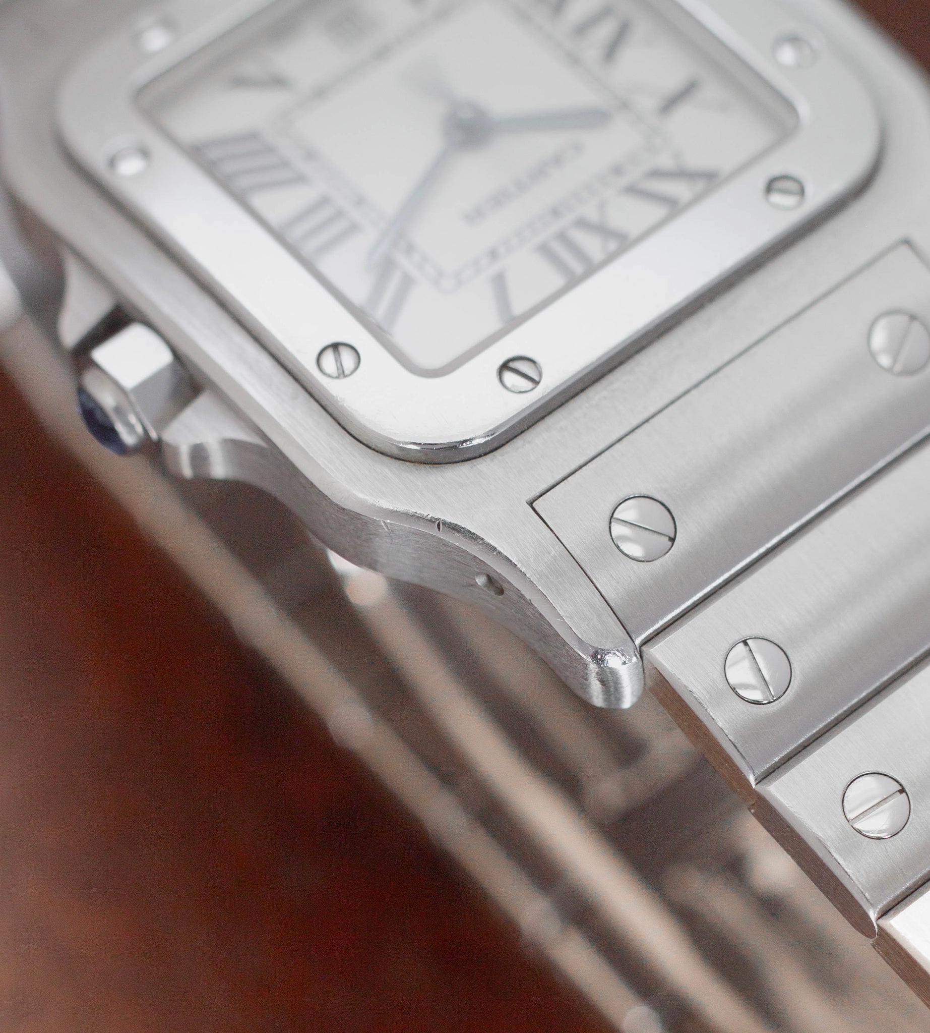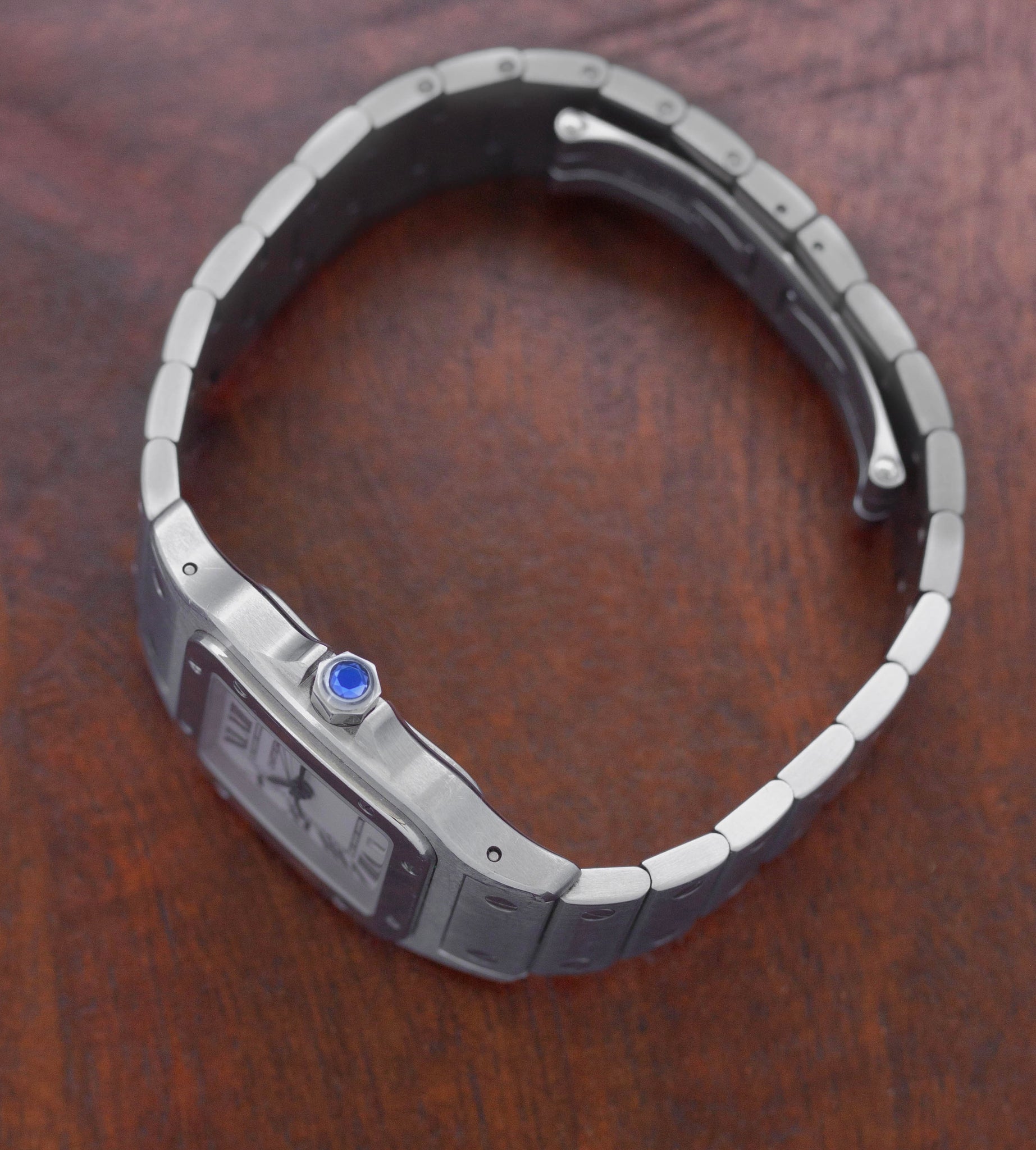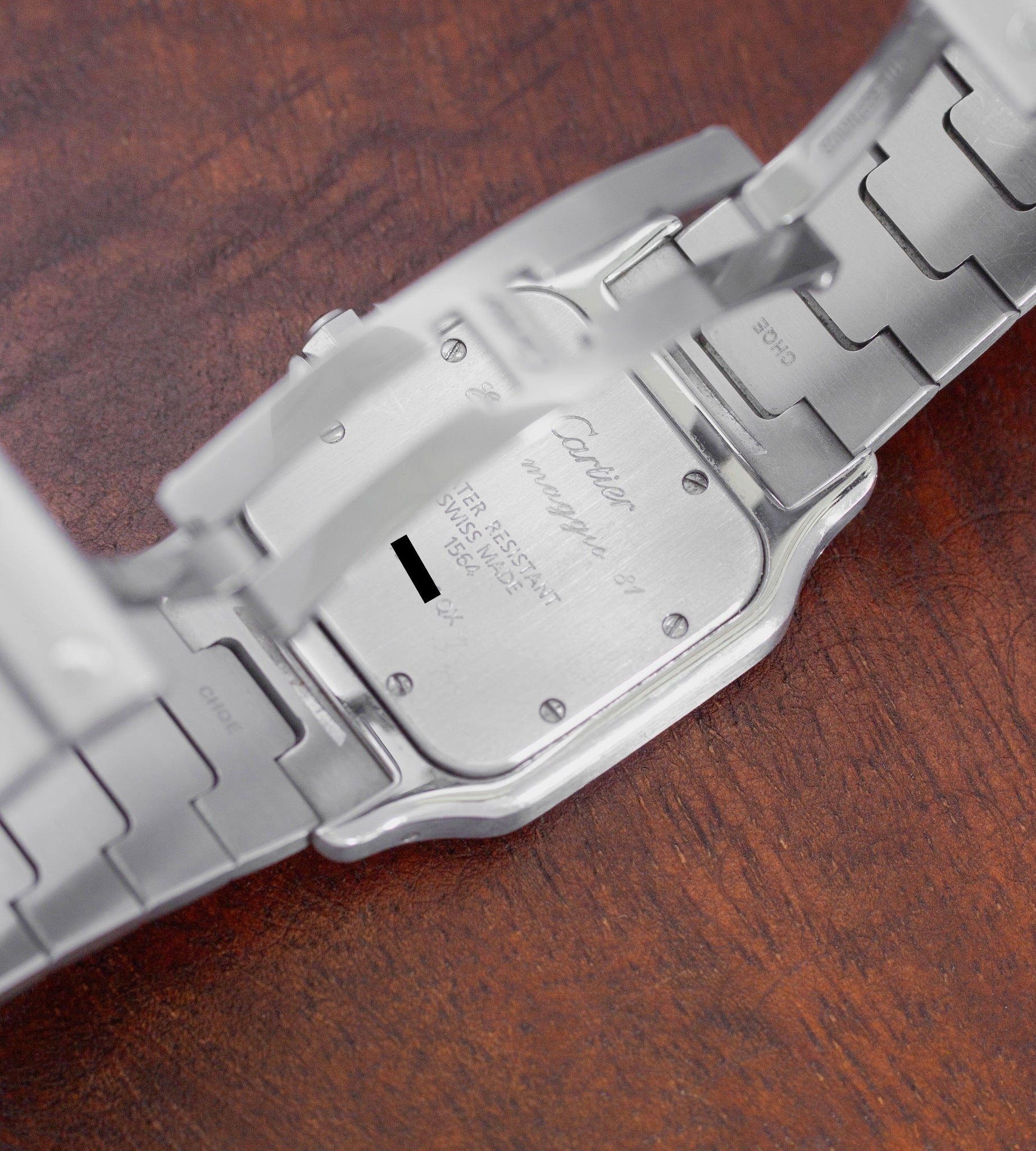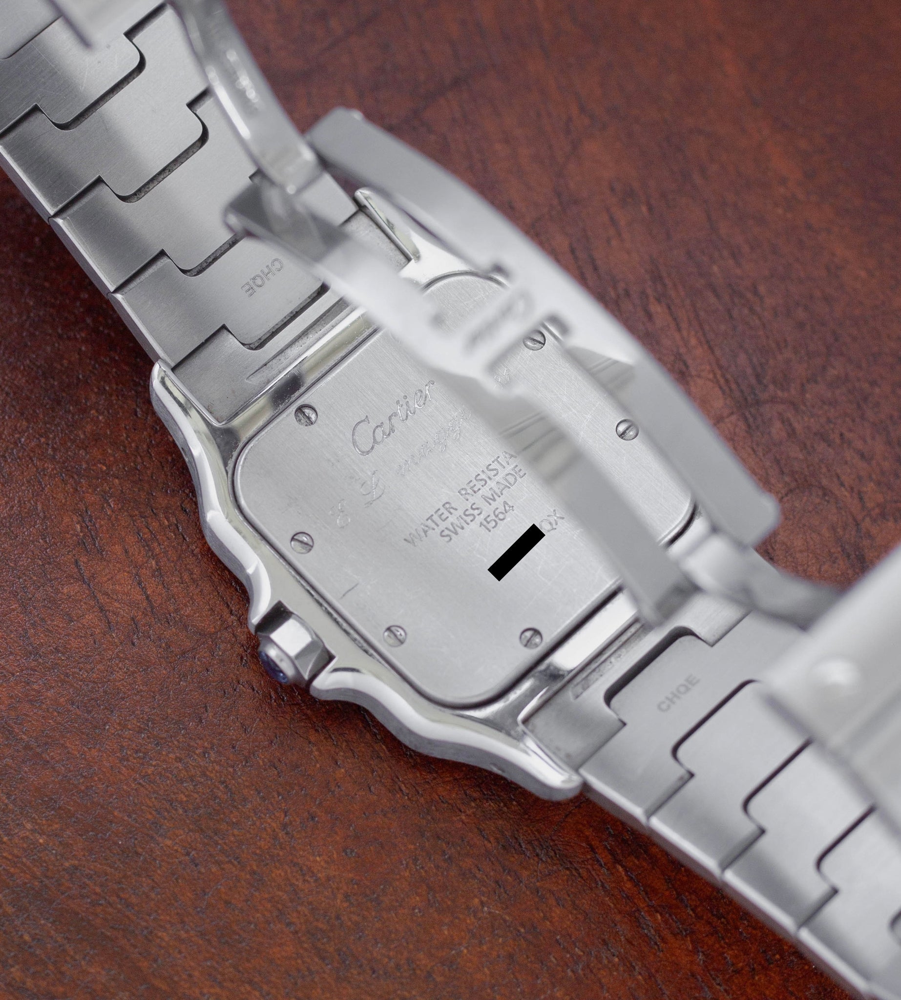 Een ander bijzonder detail is dat de achterdeksel is voorzien van een lichte gravure, die niet heel opvallend is. Waarschijnlijk is deze Cartier Santos ooit cadeau gedaan ter gelegenheid van een geschenk, herdenking of mijlpaal. We hebben er bewust voor gekozen om deze Santos Galbée volledig origineel te laten.