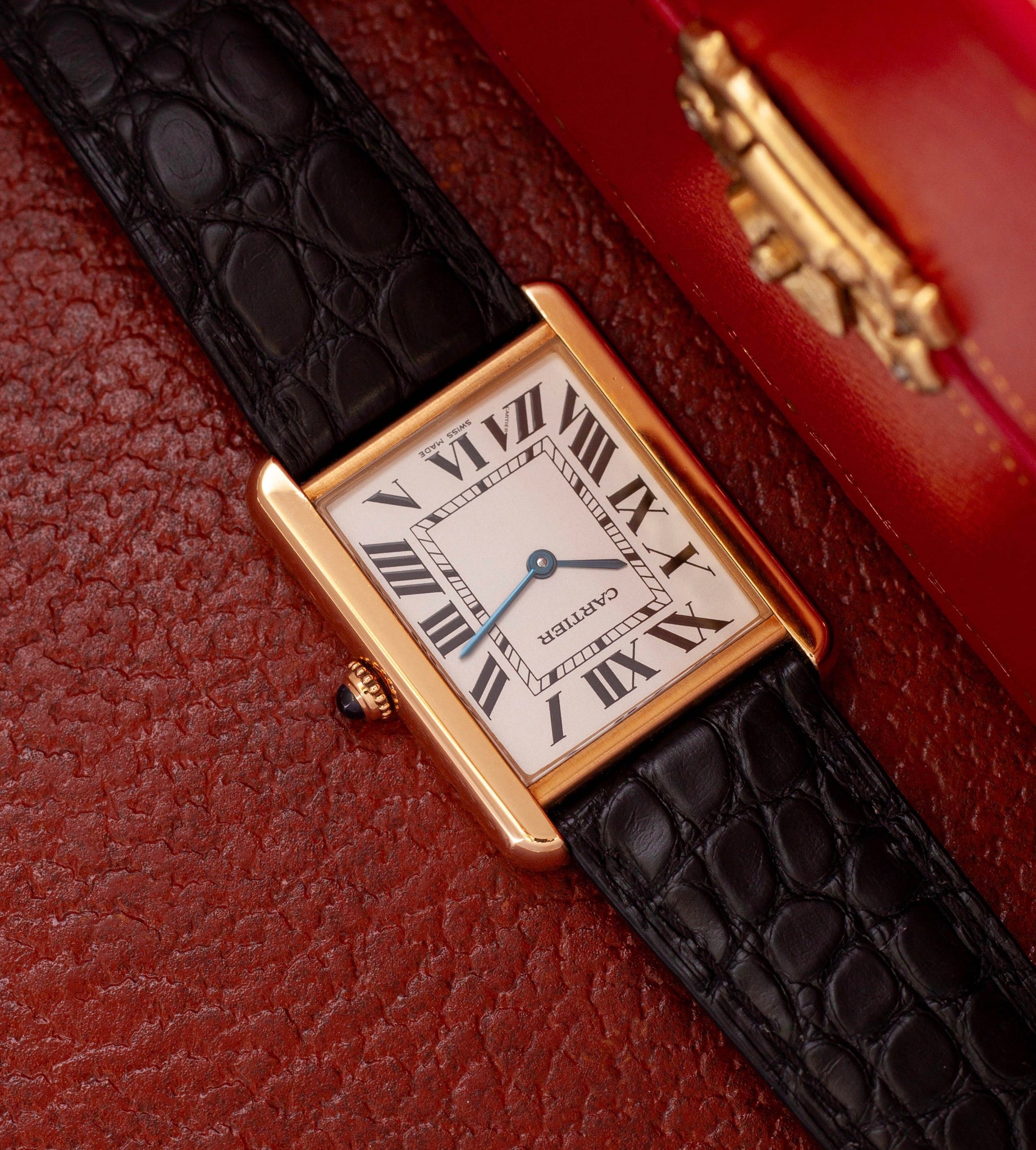 At 10 over 10, we have a fondness for vintage watches, but sometimes we like to make an exception for some newer models that also fit perfectly in our collection. The iconic Cartier Tank Solo watch we have here is made of 18K yellow gold and was produced from 2004 to around 2019. After that, the model was succeeded by the Cartier Tank Must.