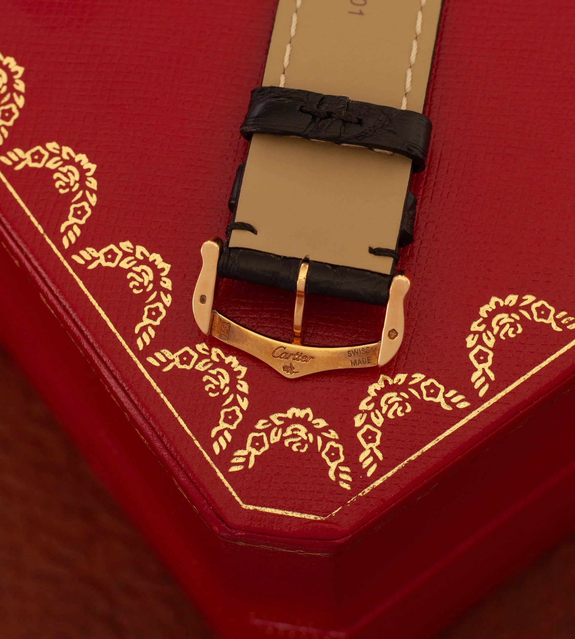 - Black leather strap with 18K yellow gold Cartier buckle